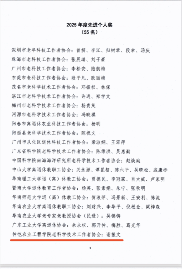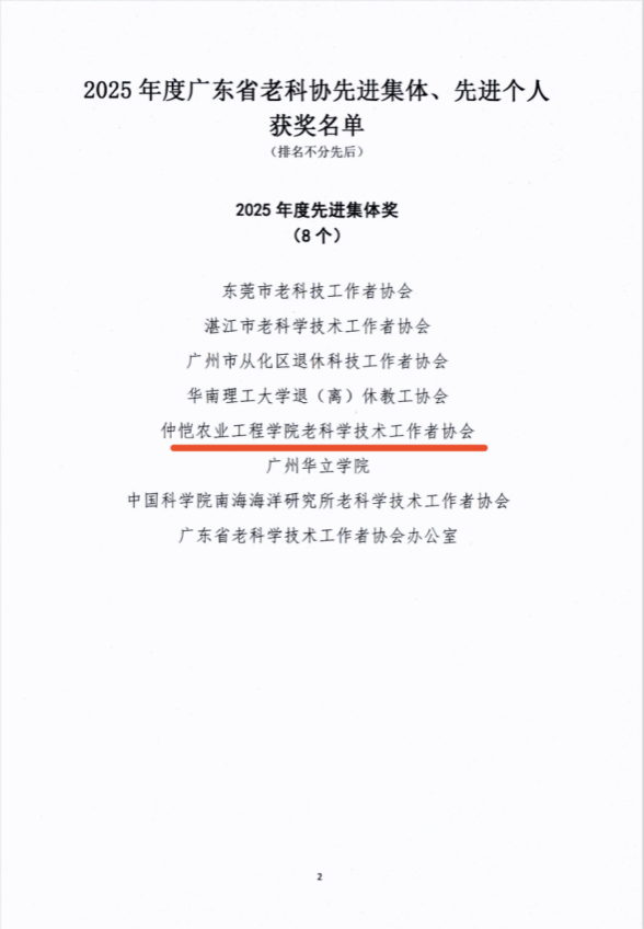 近日,广东省老科学技术工作者协会发布《粤老科协〔2026〕5号》表彰决定,仲恺农业工程学院老科学技术工作者协会(以下简称“仲恺老科协”)从全省百余个团体会员单位中脱颖而出,被授予“2025年度广东省老科协先进集体奖”,成为8家获此殊荣的单位之一。这份荣誉的获得,既是对仲恺老科协“退而不休、科技报国”生动实践的肯定,也标志着学校银龄人才工作再上新台阶。